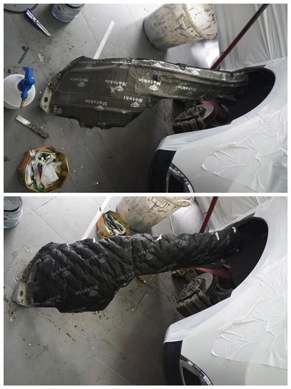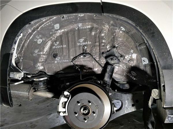 輪胎與路面及碎石與鈑金件所生成的摩擦及撞擊雜音通過前后輪弧及翼子板的震動很輕松的就傳入到駕駛艙。這些部位減震吸音施工后對降低因路面與避震器所引起的噪音,效果是很明顯的。翼子板為美特靜減震板+美特靜吸音棉,雙重隔音效果更出色。