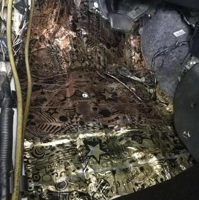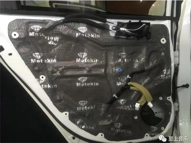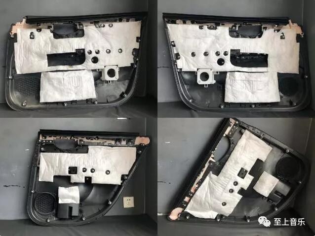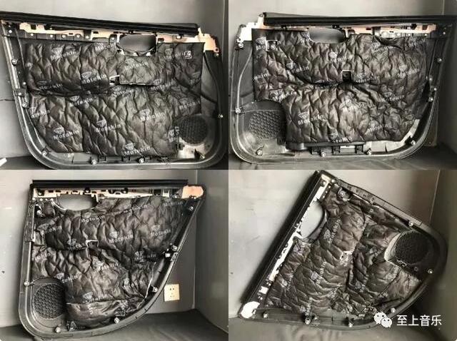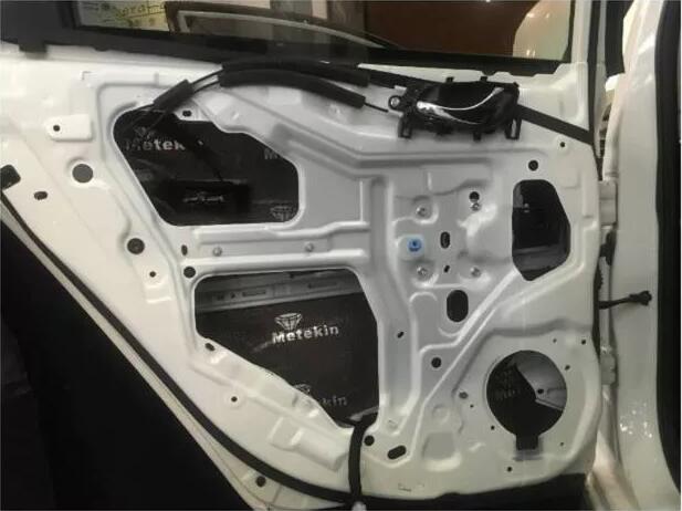 四門車門貼得工整,美觀是必須的,在車門板上鋪上一層美特靜吸音棉,這個是吸收噪音的主要功臣和隔熱性能,具有良好的回彈性,耐摩擦,及抗老化性極強(qiáng)。