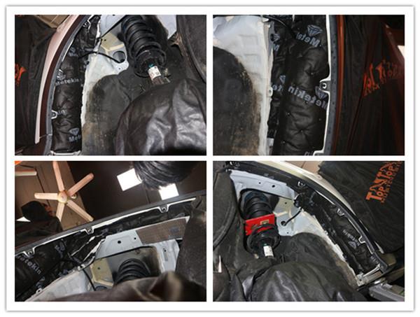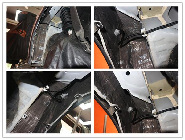 尾箱主要是路噪、胎噪、低頻噪音的主要來源,所以尾箱隔音第一層安裝美特靜減震板,增強(qiáng)鈑金的厚度。