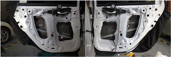 前門板進行第一層隔音處理,加固車門鈑金,減少車門共振噪音。