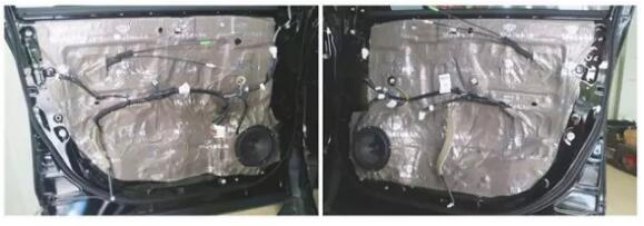 下面開始門板的隔音,技師用兩塊減震板分別鋪滿內(nèi)外門板,隔音施工完畢形成一個密封的箱體。
