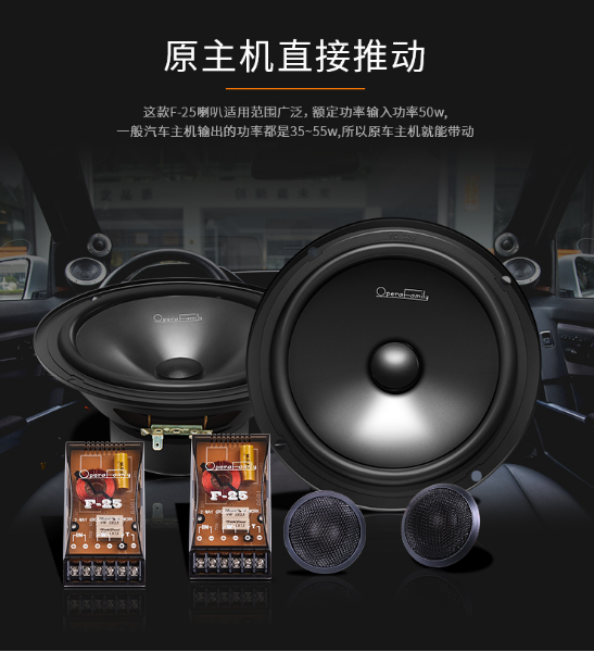 歌劇世家F-25兩分頻套裝喇叭安裝在前聲場,這套喇叭在推出市場后不久就獲得了發(fā)燒友的認可,它的中低音沉穩(wěn),高音透亮,而且全部是原位安裝,無損升級,備受青睞!