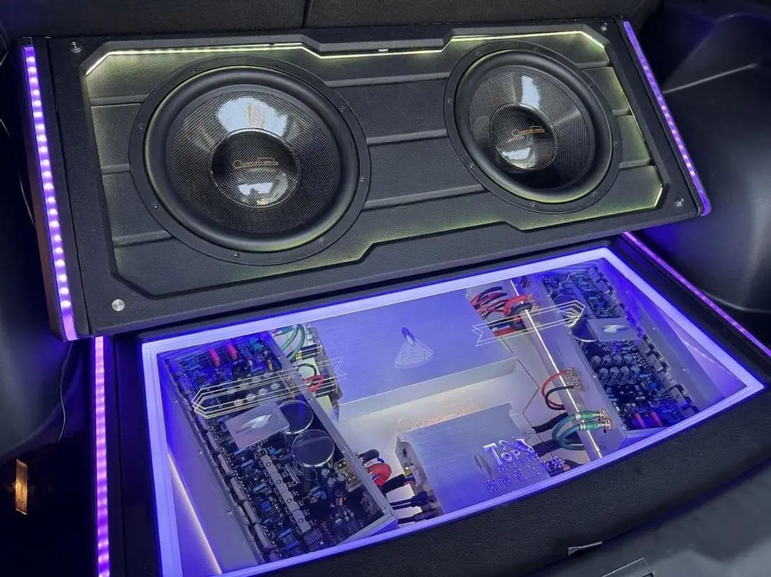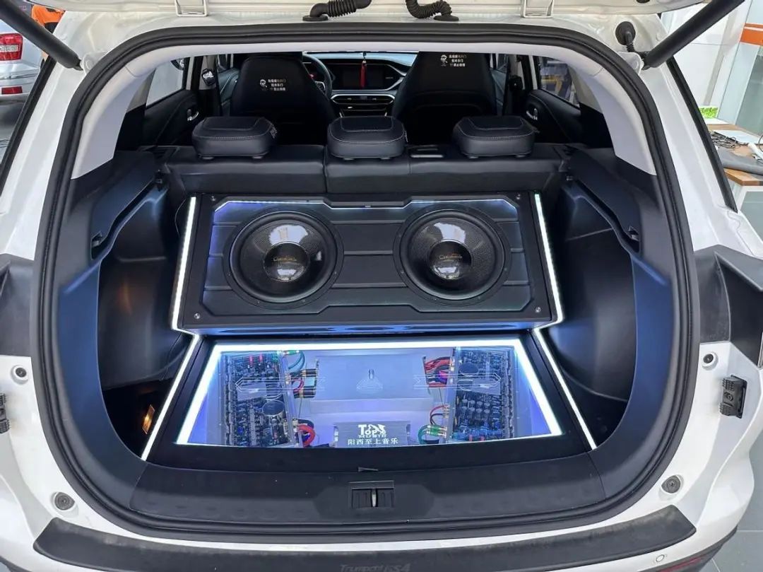 兩只十二寸超低音采用倒相箱體安裝后尾箱,三臺(tái)功率放大器和歌劇世家十路DSP功放安裝于底板下面,加上有機(jī)玻璃和氛圍燈光,使得傳祺GS4既有好聲音,又有美輪美奐的視覺享受。