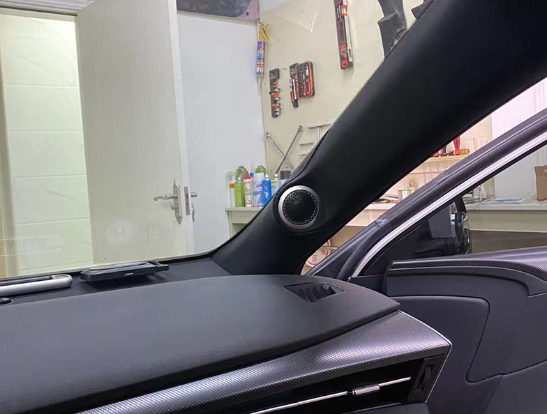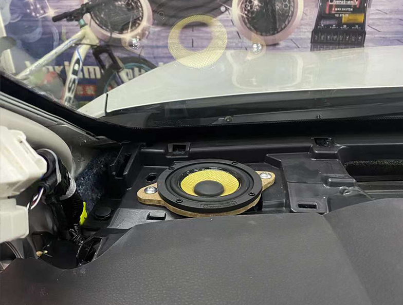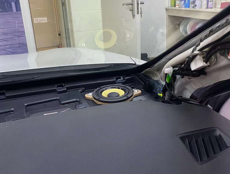 前聲場安裝一套歌劇世家VS53三分頻套裝喇叭,真實還原聲音細節(jié),帶來美妙的聆聽體驗。高音倒模安裝在A柱上,中音原位安裝,中低音單元安裝在車門原位,更有利于獲得開闊的聲場和良好的聽音體驗。