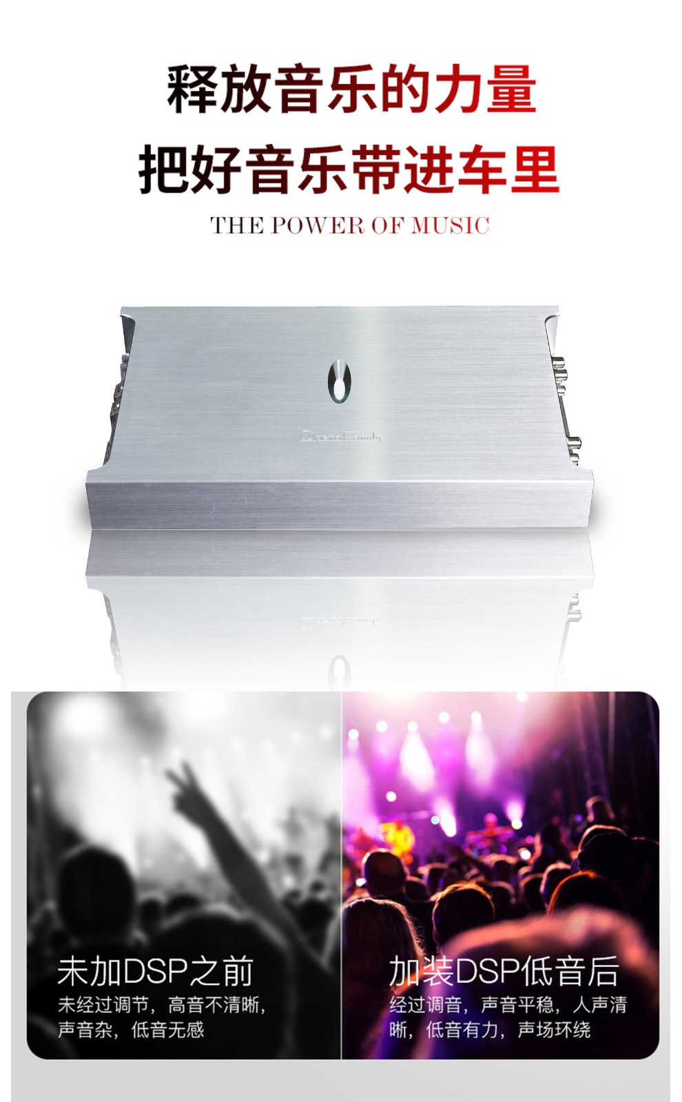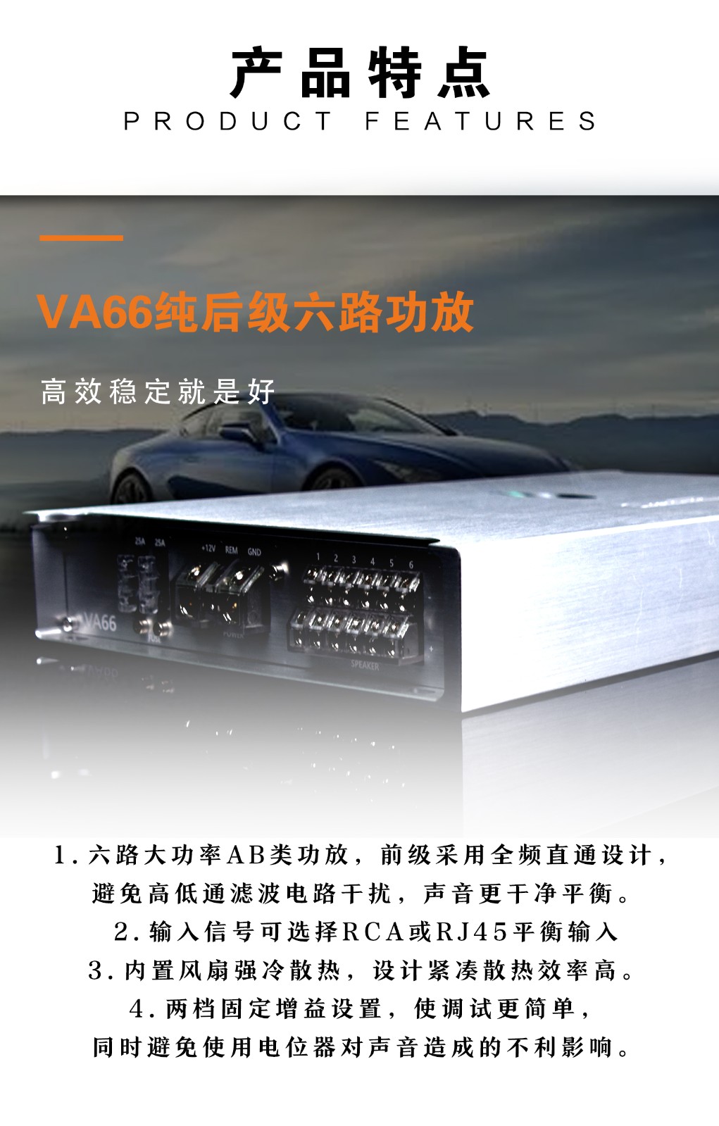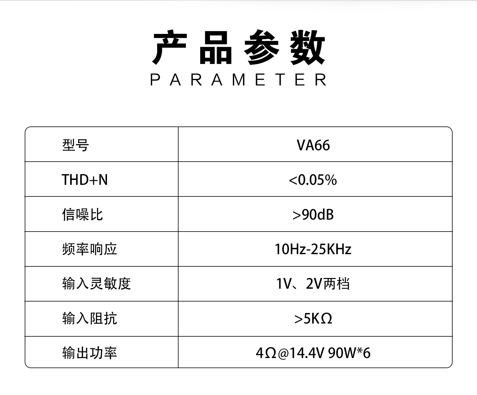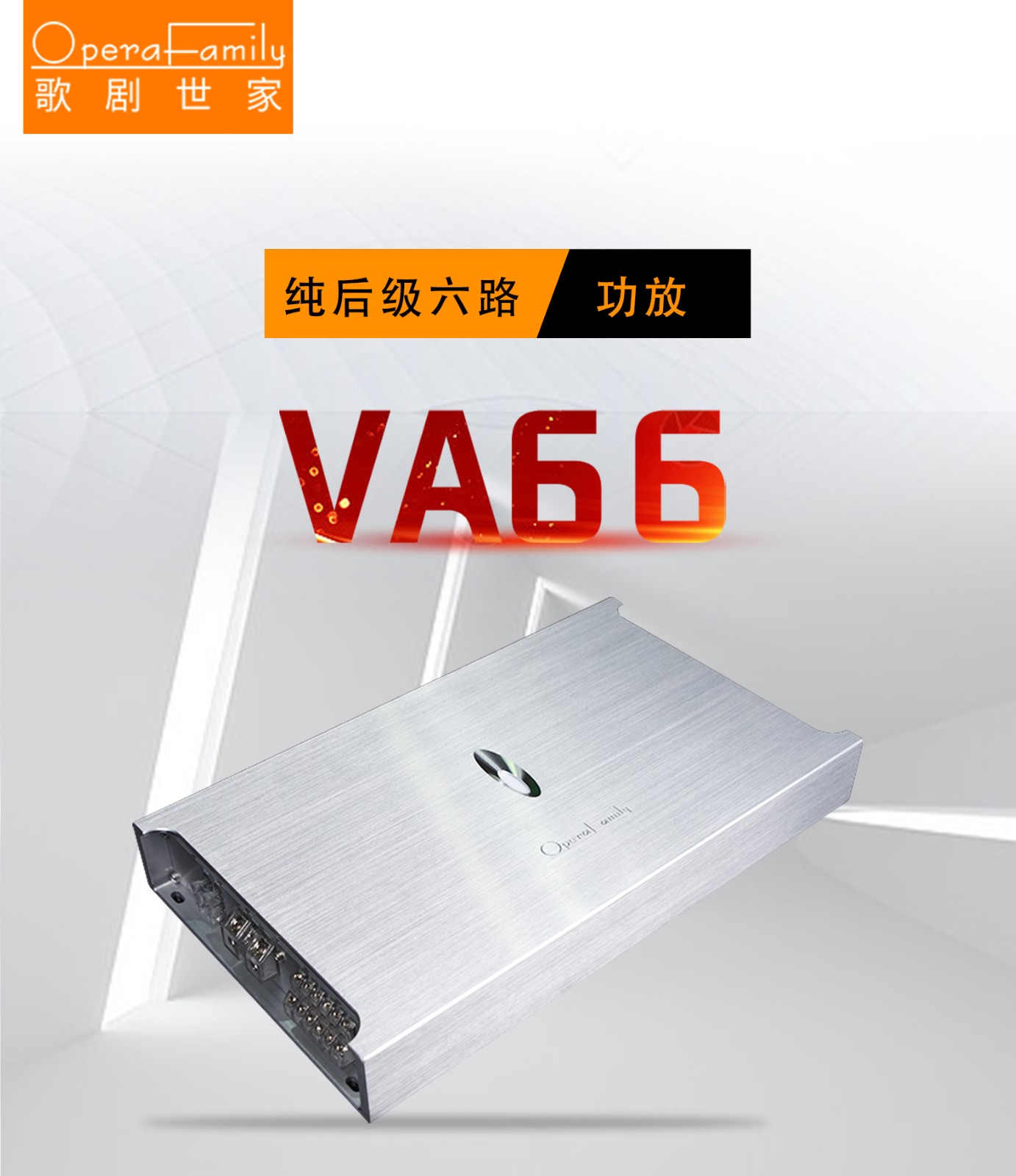 歌劇世家VA 66六路功放: THD+N:<0.05% 信噪比:>90dB 頻率響應(yīng):10Hz-25kHz±1dB 輸入靈敏度:0.5V-5V 輸入阻抗:47KΩ 待機(jī)電流:<0.1A RMS輸出功率:6×90W(4Ω) 功能及用料:前級(jí)放大器全頻直通設(shè)計(jì),避免高低通濾波電路干擾,聲音更干凈平衡,高純度銅鍍金接線端子及RCA信號(hào)輸入端子,內(nèi)置高轉(zhuǎn)低電路,支持6路高電平輸入,信號(hào)輸入采用德國(guó)威瑪耦合電容,采用進(jìn)口發(fā)燒級(jí)運(yùn)放芯片。