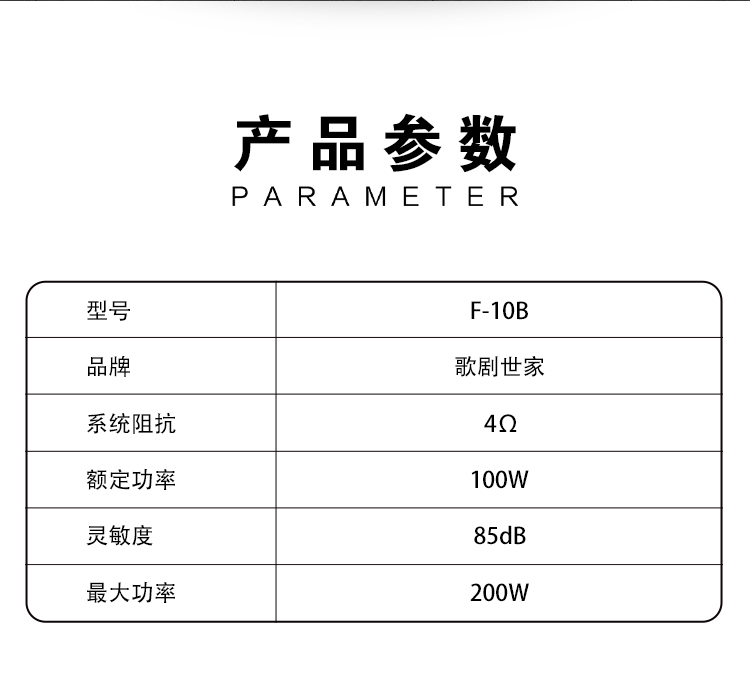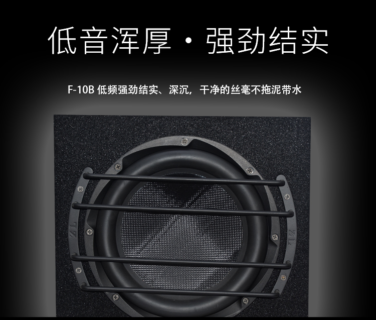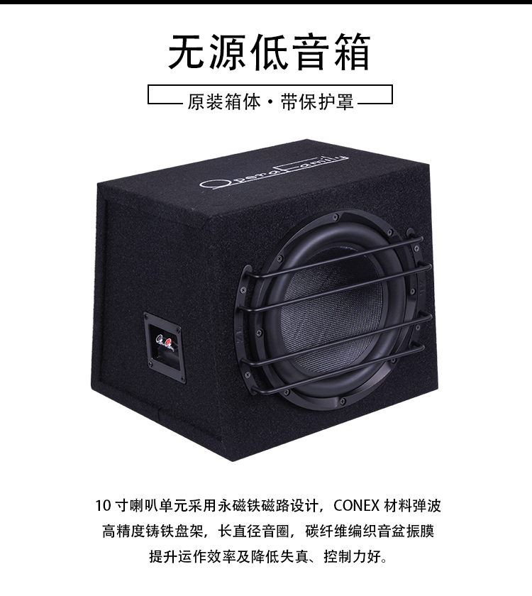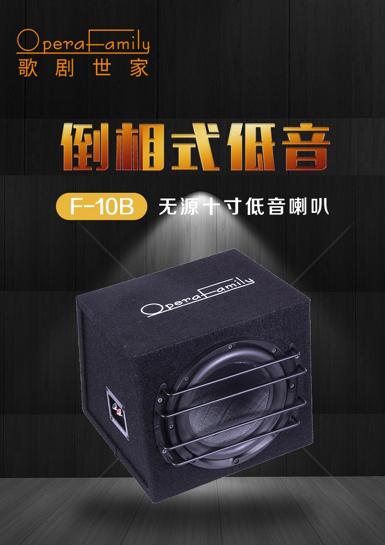 歌劇世家F-10B無源十寸低音炮:是一款無源低音音箱,自帶箱體,帶保護(hù)罩。十寸低音單元采用永磁鐵磁路設(shè)計(jì),CONEX材料彈波,高精度鑄鐵盤架,長直徑音圈,碳纖維編織音盆振膜,提升運(yùn)作效率及降低失真、控制力好。低頻強(qiáng)勁結(jié)實(shí)、深沉,干凈的絲毫不拖泥帶水。 產(chǎn)品參數(shù):額定功率:100W / 最大功率:200W / 靈敏度:85dB / 系統(tǒng)阻抗:4Ω