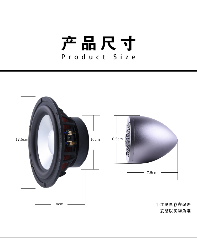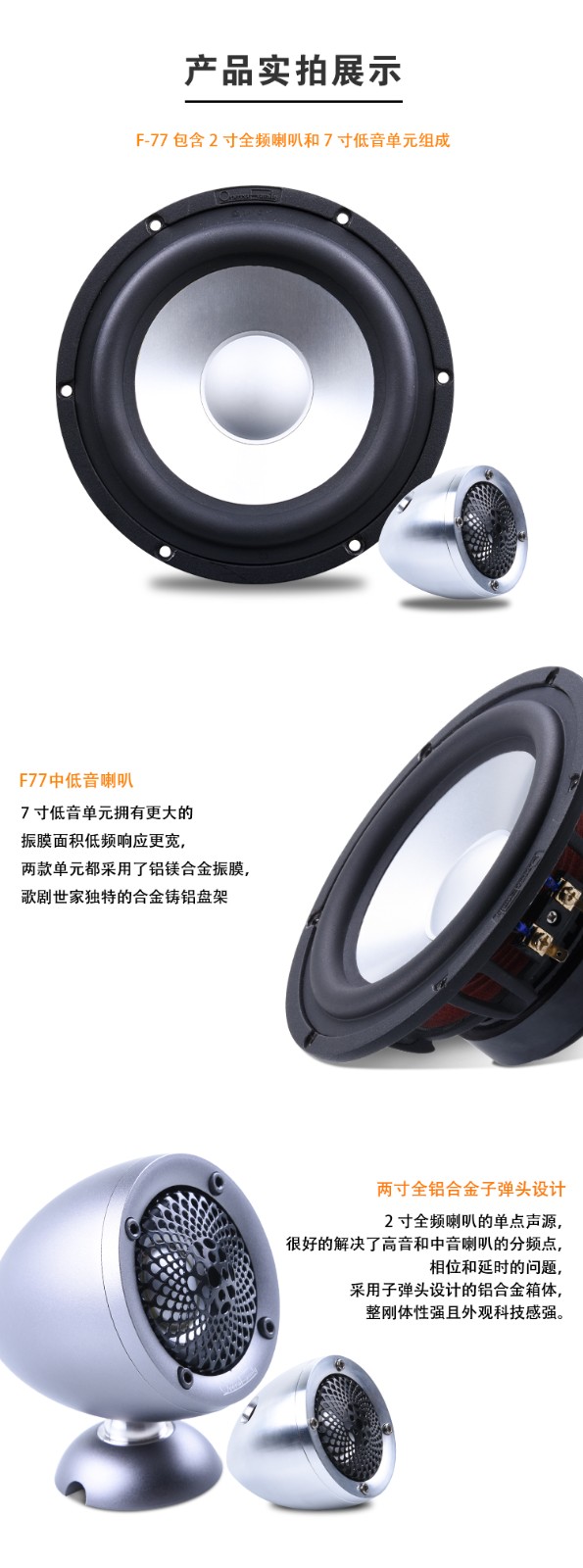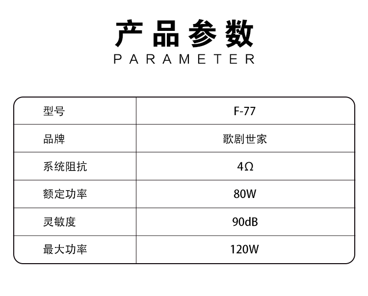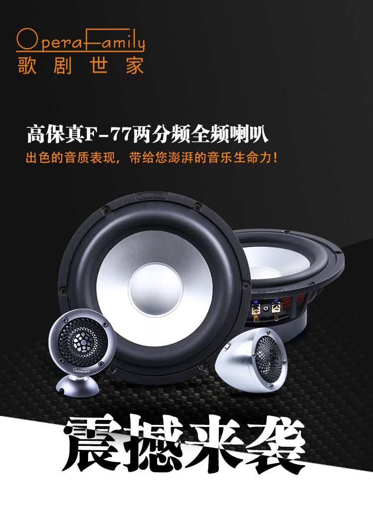 歌劇世家F-77全頻兩分頻喇叭:產品由2寸全頻喇叭和7寸低音單元組成。2寸全頻喇叭單元的單點聲源,很好地解決了高音和中音喇叭的分頻點、相位和延時等問題。全頻喇叭單元則采用了子彈頭設計的鋁合金箱體,整體剛性強且外觀科技感強。7寸低音單元擁有更大的振膜面積,低頻響應更寬。兩款單元都采用了歌劇世家獨家的鋁鎂合金振膜和合金鑄鋁盆架。 產品參數:額定功率:80W / 最大功率:120W / 靈敏度:90dB / 系統阻抗:4Ω