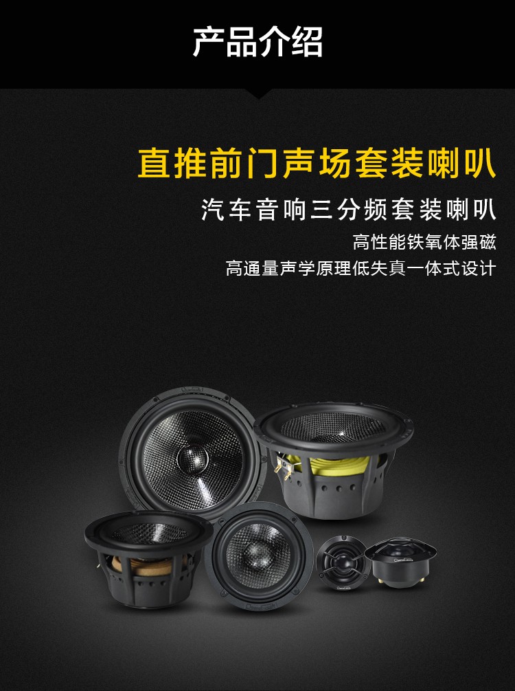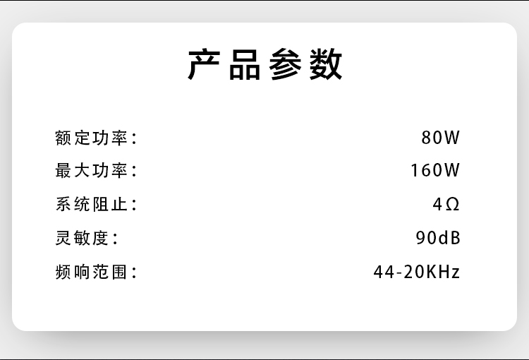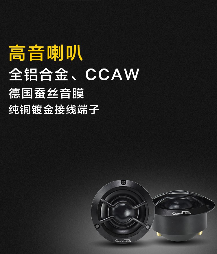 高性能鐵氧體強(qiáng)磁,高通量聲學(xué)原理低失真一體式設(shè)計(jì);高強(qiáng)度一體式鑄鋁盆架,碳纖音盆振膜;雙高性能釹鐵硼強(qiáng)磁,內(nèi)磁設(shè)計(jì);全鋁合金,CCAW,德國(guó)蠶絲音膜;純銅鍍金接線端子。 額定功率:80W 最大功率:160W 系統(tǒng)阻抗:4Ω 靈敏度:90dB 頻響范圍:44Hz-20kHz