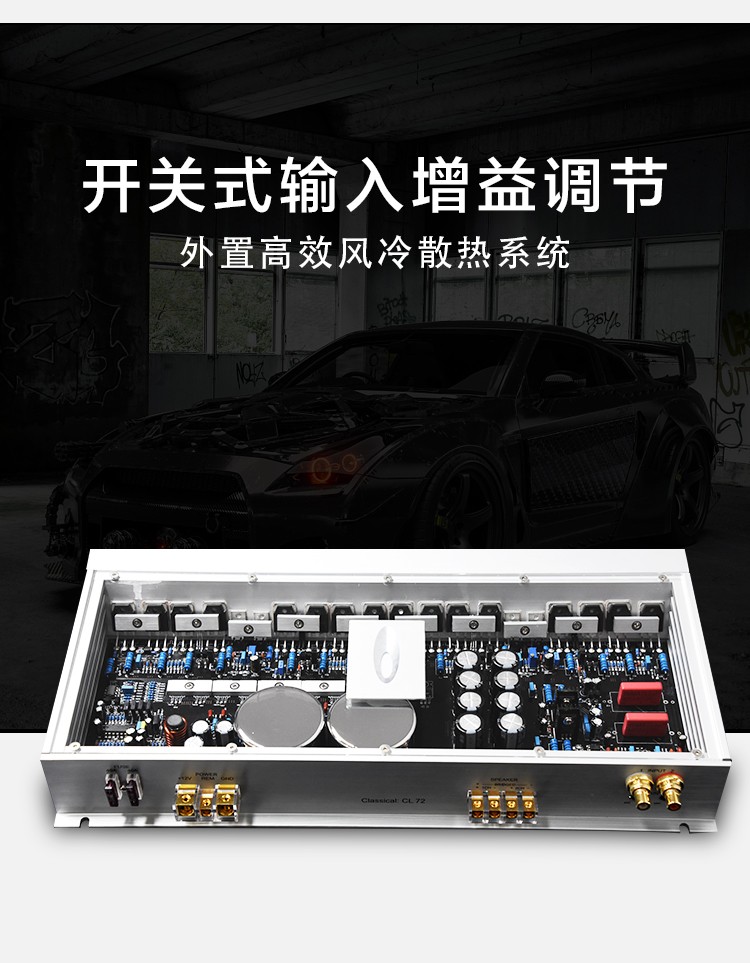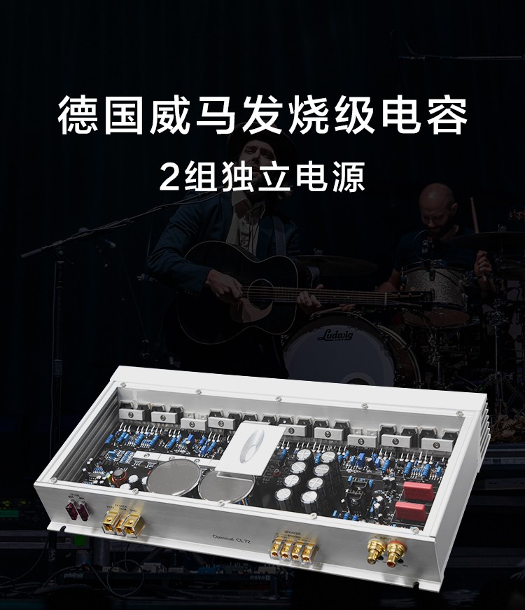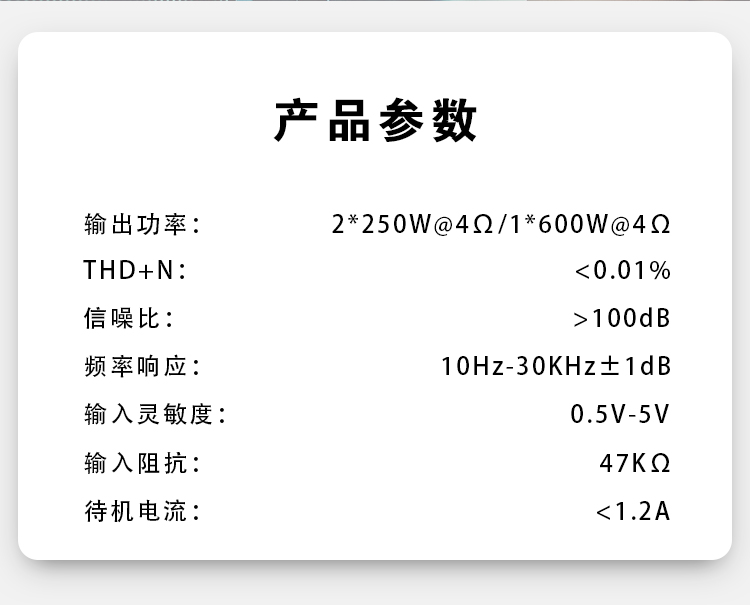 兩組獨立電源;定制純銅鍍金RCA座、電源端子、喇叭端子;德國威瑪發(fā)燒級電容;LED透視式外觀設(shè)計;開關(guān)式輸入增益調(diào)節(jié);外置高效風(fēng)冷散熱系統(tǒng)。 輸入功率:2x250W@4歐姆/1x600W@4歐姆 THD+N:<0.01% 信噪比:>100dB 頻響范圍:10Hz-30kHz±1dB 輸入靈敏度:0.5V-5V 輸入阻抗:47KΩ 待機電流:<1.2A