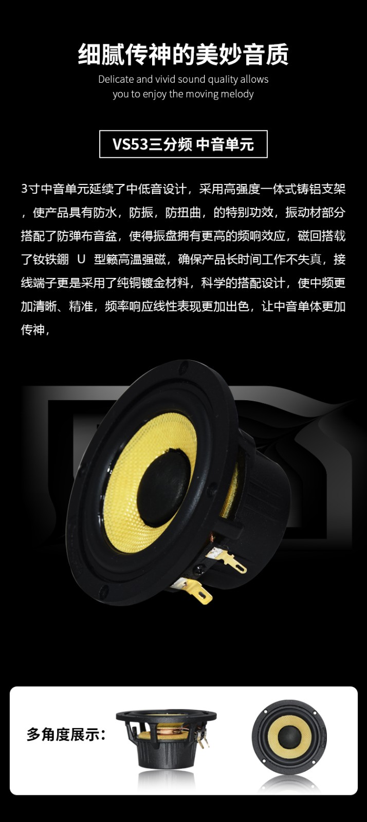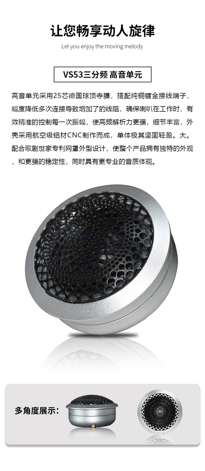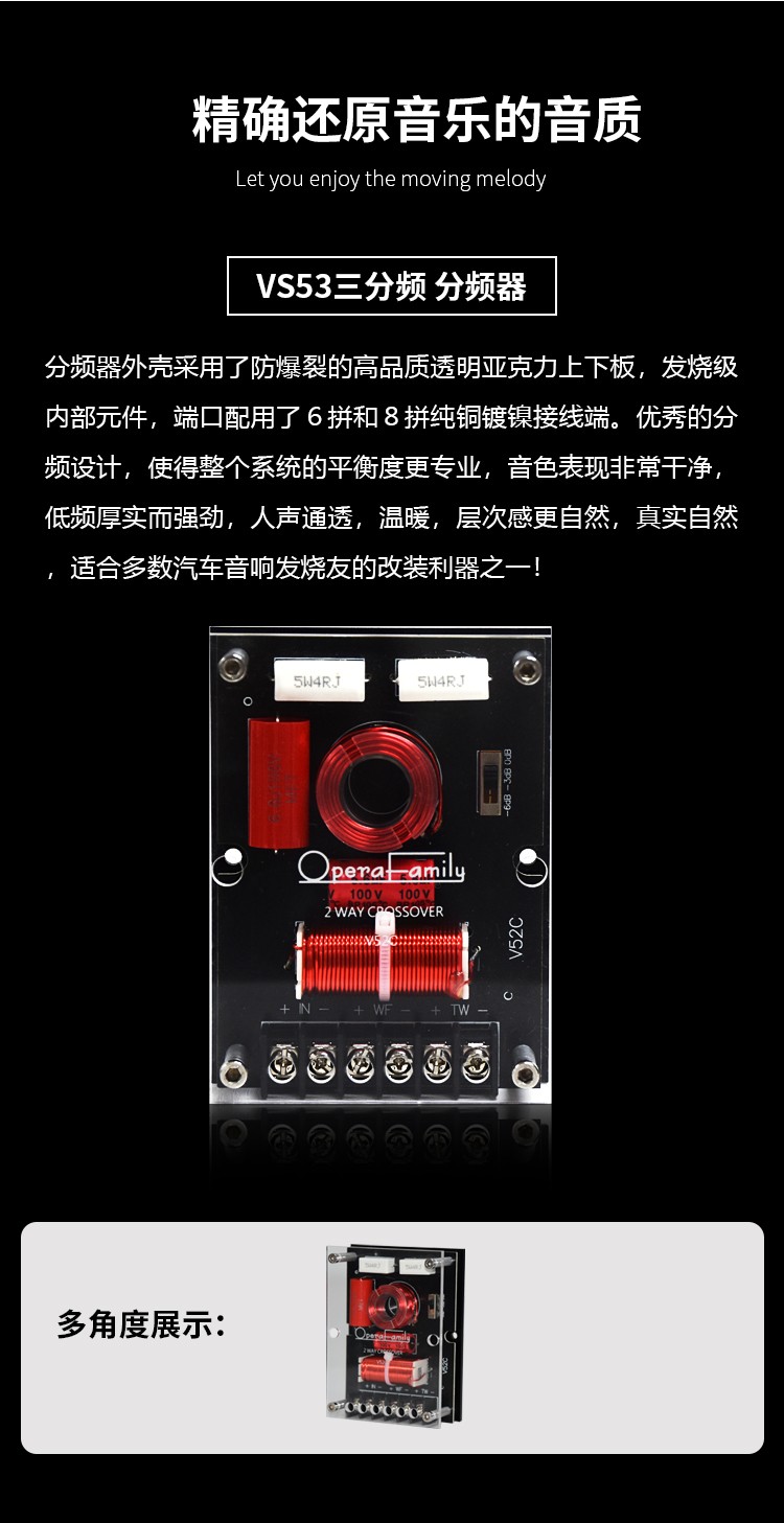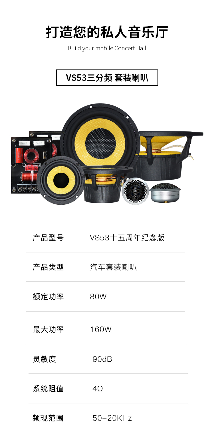 靈敏度:90dB / 系統(tǒng)阻抗:4Ω / 額定功率:70W / 最大功率:140W / 頻響范圍:50Hz-20kHz 高音采用25芯德國球頂絲膜,CNC全鋁外殼及鍍金銅接線端子; 中音喇叭,防彈布音盆,高強度一體式鑄鋁支架,鍍金純銅接線端子; 6.5寸低音喇叭,防彈布音盆,高強度一體式鑄鋁支架,鍍金純銅接線端子; 分頻器精選發(fā)燒級元件及防爆裂的優(yōu)質(zhì)透明亞克力蓋; 歌劇世家專利喇叭罩。